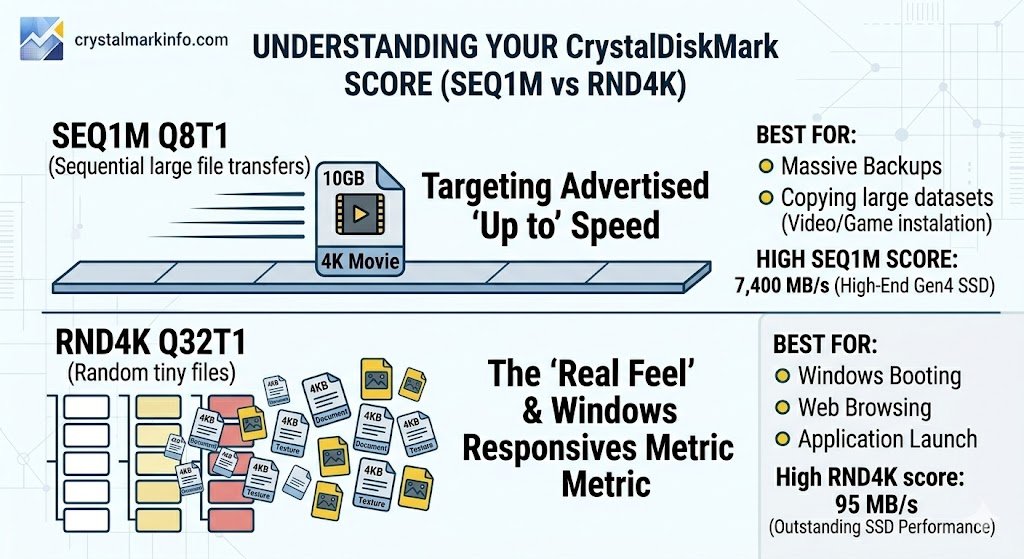 Wondering what a good CrystalDiskMark score is? We break down SEQ1M vs RND4K speeds and provide average benchmark ranges for HDDs, SATA SSDs, and NVMe drives.
